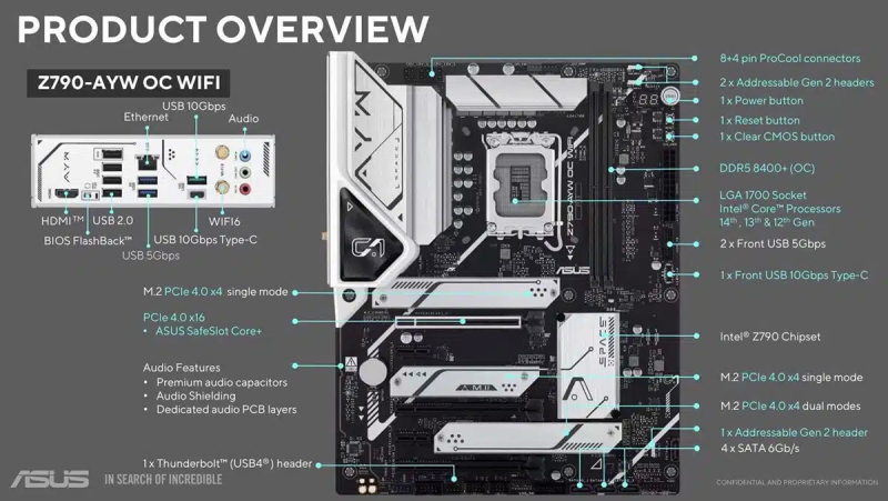 A Asus anunciou a placa-mãe Z790-AYW WIFI W. O novo produto no formato ATX foi projetado para os processadores Intel Alder Lake, Raptor Lake e Raptor Lake Refresh, oferece suporte para overclock e competirá com a série MSI MPower Z790 de placas de overclock baratas. A Asus também está se preparando para lançar uma modificação especial desta placa, a Z790-AYW OC WIFI, que se diferencia pela presença de dois, em vez de quatro, conectores DIMM para RAM, o que aumenta o potencial de overclock desta última.