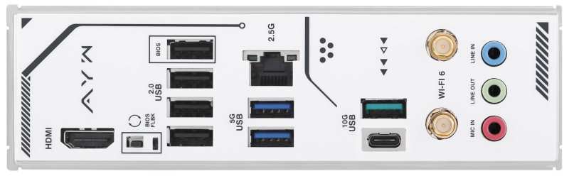 O fabricante afirma que o novo produto suporta os padrões wireless Wi-Fi 6 e Bluetooth 5.3, bem como a presença de um conector de rede LAN de 2,5 gigabits. O painel traseiro de conectores inclui um USB Tipo C e Tipo A (ambos de 10 Gbps), dois USB Tipo A (5 Gbps) e quatro USB 2.0. Além disso, conectores de áudio para áudio de 7.1 canais Realtek 7.1 Surround Sound High Definition Audio também estão localizados aqui.
