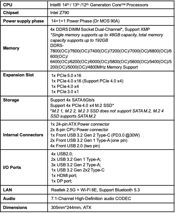 O novo produto suporta instalação de até 192 GB de RAM (SO) DDR5-7800, recebeu um conector PCIe 5.0 x16, PCIe 4.0 x16, PCIe 4.0 x4 e PCIe 3.0 x1, além de quatro portas SATA III (6 Gbps). Além disso, está equipado com um adaptador de rede LAN de 2,5 Gbit e suporta Wi-Fi 6E.