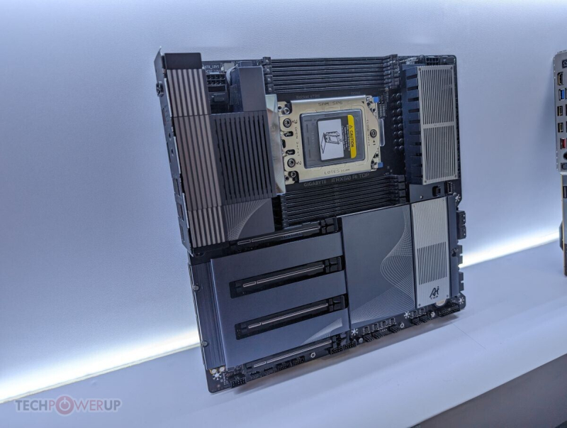 Também no estande da Gigabyte eles mostraram a placa TRX50 AI TOP, projetada para processadores Ryzen Threadripper 7000 para estações de trabalho. A novidade apresentada oferece suporte para memória DDR5 de oito canais, quatro slots PCIe 5.0 x16 de tamanho normal e meia dúzia de conectores M.2 para unidades NVMe, a maioria dos quais suporta o padrão PCIe 5.0.
