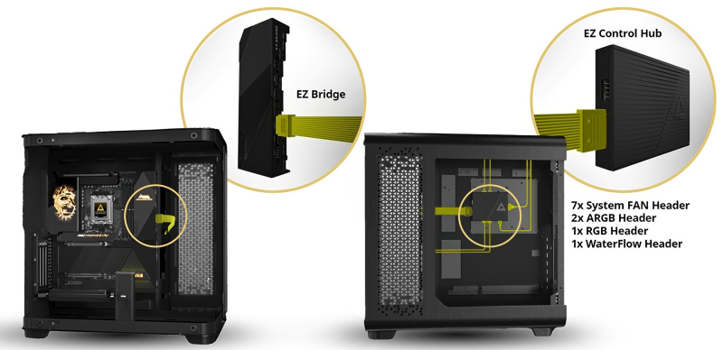 A placa é fornecida com um controlador EZ Control Hub. Ele se conecta à placa-mãe com apenas um cabo, mas ao mesmo tempo permite conectar todas as luminárias e ventoinhas ARGB instaladas no PC.