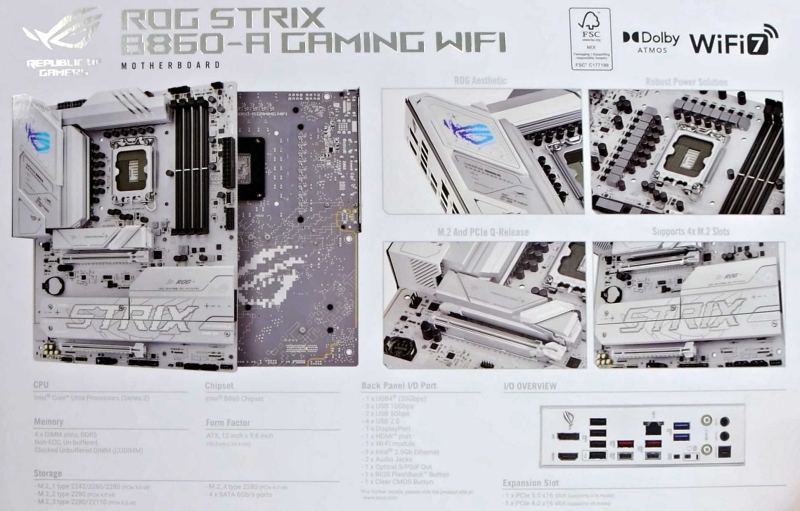 A placa Asus ROG Strix B860-A é feita nas cores preto e branco e oferece o formato ATX usual. É equipado com dois conectores PCIe x16: um suporta o padrão PCIe 5.0, o segundo suporta PCIe 4.0. O novo produto também oferece instalação de até quatro drives NVMe do formato M.2 2280 e um M.2 22110. Um dos slots SSD é compatível com PCIe 5.0.
