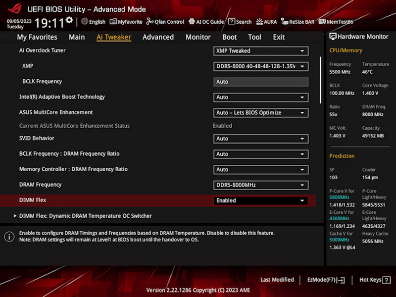 O DIMM Flex foi projetado para resolver o problema descrito acima. Para fazer isso, em alguns modelos de suas placas Z790 atualizadas, a ASUS instalou um sensor de temperatura próximo aos slots DIMM. Os dados do sensor são processados ​​​​por um controlador especial na placa, após o qual são enviados para a CPU, dando a esta um comando para alterar a frequência da RAM. Formalmente, estamos falando de alterar dinamicamente a frequência operacional da RAM, levando em consideração a carga, a temperatura e alguns outros parâmetros. Neste caso, aparentemente, as informações de temperatura do controlador PMIC interno nos próprios módulos de memória não são levadas em consideração.
