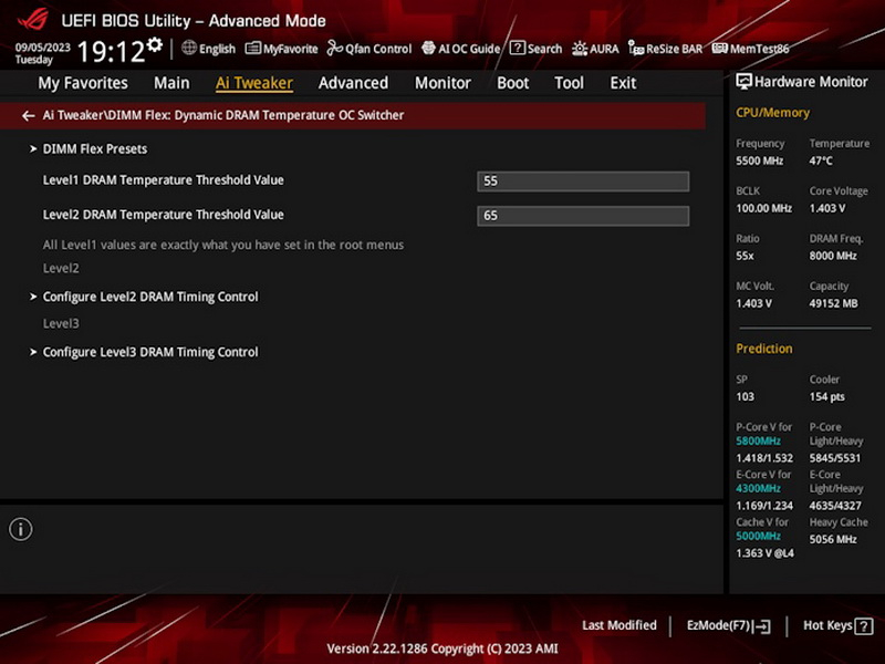 Depois disso, você pode deixar todas as configurações padrão ou definir manualmente restrições de temperaturas e horários. O DIMM Flex oferece três níveis de configurações com base em pontos de ajuste de temperatura variáveis, permitindo configurações de desempenho extremo em baixas temperaturas, configurações menos agressivas quando a RAM aquece um pouco e ainda menos configurações de desempenho quando o limite de temperatura da memória é atingido. As configurações de nível 1 correspondem àquelas definidas no menu de configurações raiz da DRAM (perfil básico ou XMP). Para os níveis 2 e 3, você pode selecionar intervalos menores para ajustar o desempenho da RAM de acordo com seus cenários de uso.