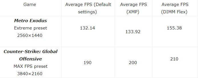A empresa explica que dependendo do jogo, da resolução de tela selecionada e das configurações do jogo, o Flex DIMM pode melhorar significativamente as taxas de quadros. Por exemplo, no jogo Metro Exodus, rodando na resolução 1440p, com as configurações de qualidade “Extreme” e com a função DIMM Flex habilitada, o aumento de FPS foi de 17,59% em relação às configurações padrão de RAM. O novo recurso DIMM Flex proporcionou uma vantagem de desempenho mesmo em relação ao perfil otimizado de overclock de memória XMP. Este último aumentou o desempenho neste jogo em apenas 1,35% em comparação com as configurações de memória padrão. No Counter-Strike: Global Offensive com resolução 4K, o perfil XMP foi capaz de aumentar o FPS em 5,26%, e o DIMM Flex aumentou o FPS em 10,53%.