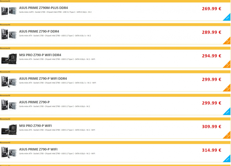 Nove placas ASUS no Z790 apareceram na loja alemã Caseking. A faixa de preço dos modelos varia de € 309,90 a € 1399,90. Curiosamente, os modelos mais acessíveis de placas da série ASUS Prime para processadores Core de 13ª geração acabaram sendo mais baratos que os modelos de placas ASUS Prime baseados no chipset AMD X670 para processadores Ryzen 7000. Por exemplo, versões com suporte a RAM DDR4 são mais baratas em cerca de € 60, e modelos com suporte DDR5 são € 20 mais baratos.