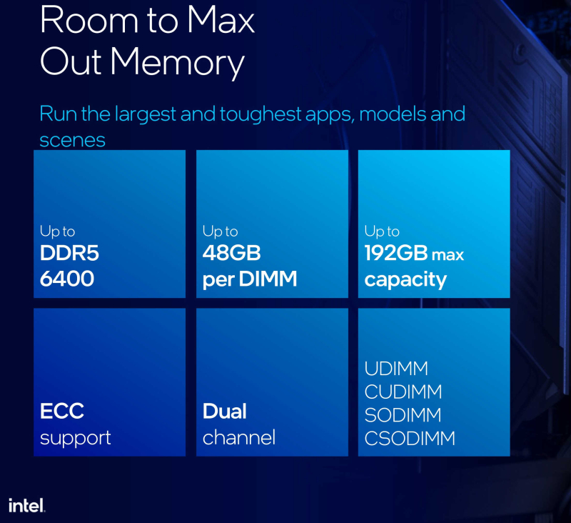 É importante notar que a Intel realmente melhorou o suporte para memória DDR5 na nova plataforma Arrow Lake-S, incluindo suporte para módulos CUDIMM, que são equipados com seus próprios geradores de clock para operação estável da RAM em frequências mais altas. No entanto, a plataforma Intel Arrow Lake-S suporta oficialmente memória até DDR5-6400 sem overclock.