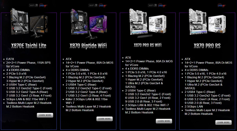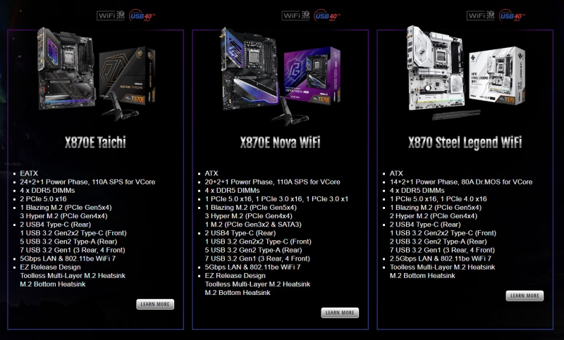Todos os modelos de placas-mãe apresentados, com exceção da X870 PRO RS, suportam Wi-Fi 7. Todos os novos produtos possuem um conector PCIe 5.0 x16, e os modelos X870E Taichi e X870E Taichi Lite possuem dois deles. Além disso, todos possuem um slot M.2 PCIe 5.0 x4 e oferecem pelo menos um PCIe 4.0 x4 para unidades NVMe.