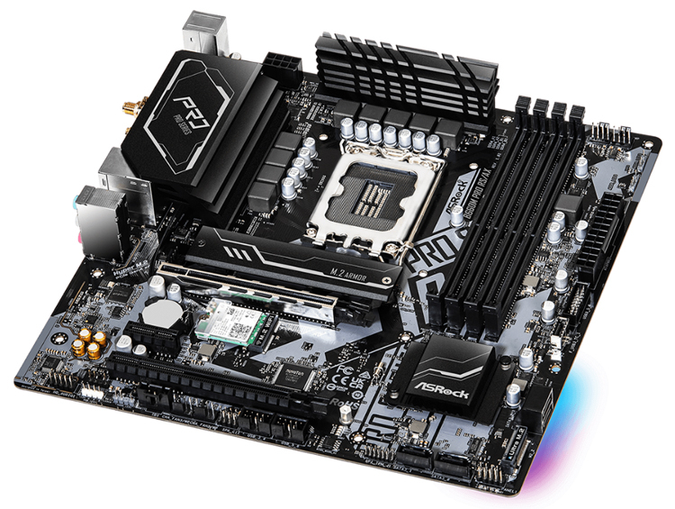 A solução corresponde ao tamanho Micro ATX – 244 × 244 mm. Quatro slots estão disponíveis para módulos de RAM DDR4-5333+(OC) com capacidade total de até 128 GB. Existem quatro portas SATA 3.0 para unidades com a capacidade de formar matrizes RAID 0/1/5/10.