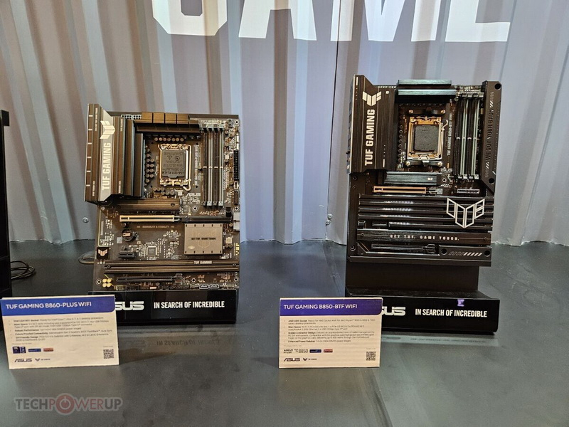 Entre as placas da série BTF mostradas na exposição estão os modelos TUF Gaming B850-BTF WIFI e B860-PLUS WIFI com novo design. O primeiro foi projetado para as últimas gerações de processadores Ryzen e está equipado com um soquete de processador Socket AM5, enquanto o segundo foi projetado para chips Intel Arrow Lake-S e possui um soquete de processador LGA 1851.