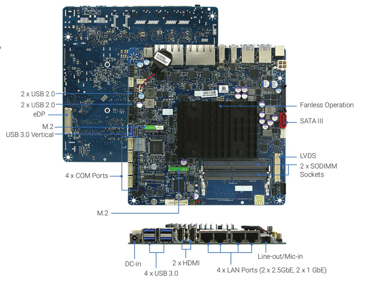 A novidade tem duas portas de rede 2,5 GbE baseadas no controlador Intel I225-LM e duas portas Gigabit Ethernet baseadas no Intel I211-AT. O conjunto de conectores também inclui quatro portas USB 3.0 Tipo-A, duas interfaces HDMI e um conector de áudio combo 3,5 mm.