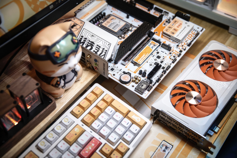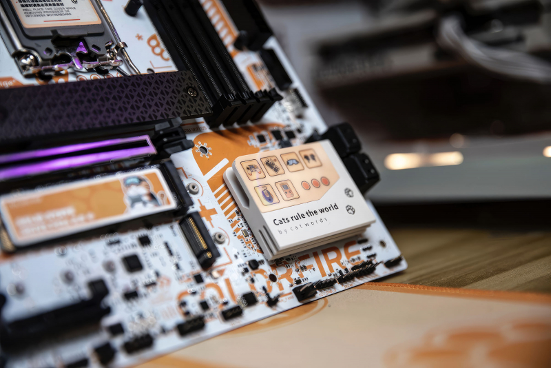 A principal característica da novidade é sua aparência. A placa-mãe é construída em textolite branco. Alguns de seus elementos são de cor laranja. De vez em quando, no quadro, há imagens de focinhos e pegadas de gatos, e no radiador de resfriamento do chipset Intel B760 há uma inscrição: “As focas dominam o mundo”. E é difícil argumentar contra isso.