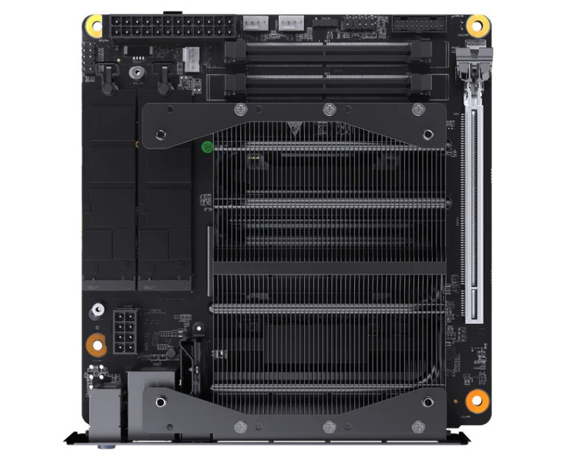 O novo produto também conta com um radiador adicional com ventoinha para resfriar o slot M.2 para unidades NVMe. Com base nessa plataforma, você pode montar, por exemplo, um armazenamento de rede de alto desempenho (NAS). Os usuários nem precisam comprar uma placa de vídeo adicional aqui, já que o Ryzen 9 7945HX3D é equipado com gráficos Radeon 610M integrados. No entanto, também existe a possibilidade de instalar uma placa de vídeo – a placa possui um conector PCIe 5.0 x16 completo.
