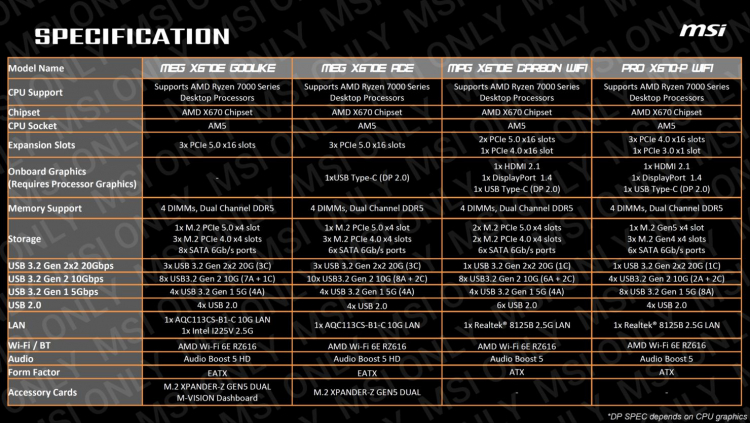 A MSI revelou as placas-mãe MEG X670E Godlike, MEG X670E Ace, MPG X670E Carbon WIFI e PRO X670-P WIFI na Computex 2022. Os três primeiros são baseados no chipset AMD X670E, o modelo Pro é baseado no chipset AMD X670. Os novos itens são projetados para os próximos processadores AMD Ryzen 7000 (Raphael), mais detalhes sobre os quais podem ser encontrados na nota anterior.