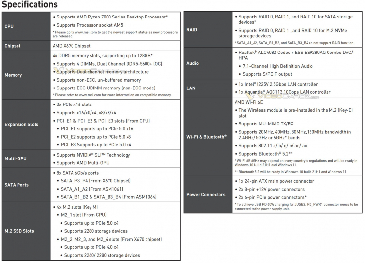 O modelo Godlike MEG X670E é uma placa premium. É feito no formato E-ATX e tem dimensões de 305 × 288 mm. A novidade é baseada no antigo chipset AMD X670E, que é um conjunto de dois chips AMD B650. Graças a isso, a placa fornecerá suporte para interfaces PCIe 5.0 para conectar unidades de estado sólido e placas de vídeo.