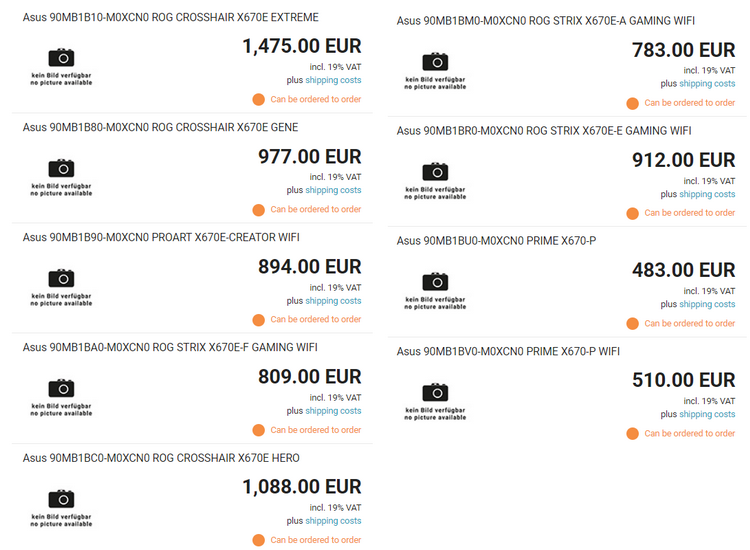 Em geral, o custo das placas-mãe ASUS baseadas no chipset AMD X670E de um varejista alemão começa em 783 euros, enquanto o custo dos modelos baseados no chipset AMD X670 varia de 483 a 510 euros. A lista completa pode ser conferida abaixo: