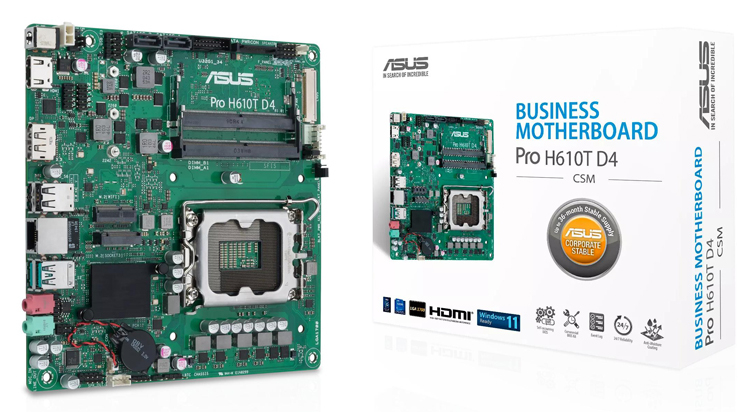 A ASUS anunciou a placa-mãe Pro H610T D4-CSM para o setor corporativo. A novidade pode ser usada para construir computadores compactos projetados para operar 24 horas por dia.