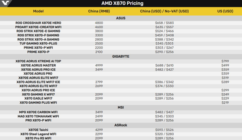 A Gigabyte preparou 11 placas de uma vez. Os preços começam em US$ 256 para o modelo X870 Eagle WIFI7 e chegam a US$ 610 para o modelo pré-carro-chefe X870E Aorus Master. O custo do carro-chefe X870E Aorus Xtreme AI TOP ainda é desconhecido. Por fim, a Asus lançará 8 placas custando a partir de US$ 256 para o modelo PRIME X870-P e até US$ 583 para o ROG Crosshair X870E Hero.