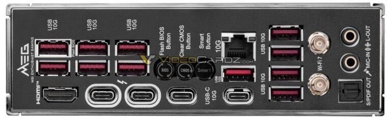 A imagem do painel traseiro de conectores da placa Z890 ACE também indica a presença de suporte para interface Thunderbolt 4, LAN de 10 Gbit e Wi-Fi 7. O botão “Smart Button” no mesmo painel de conectores pode ser programado para desempenhar uma determinada função. Ao lado dele estão os botões de atualização e redefinição das configurações do BIOS.
