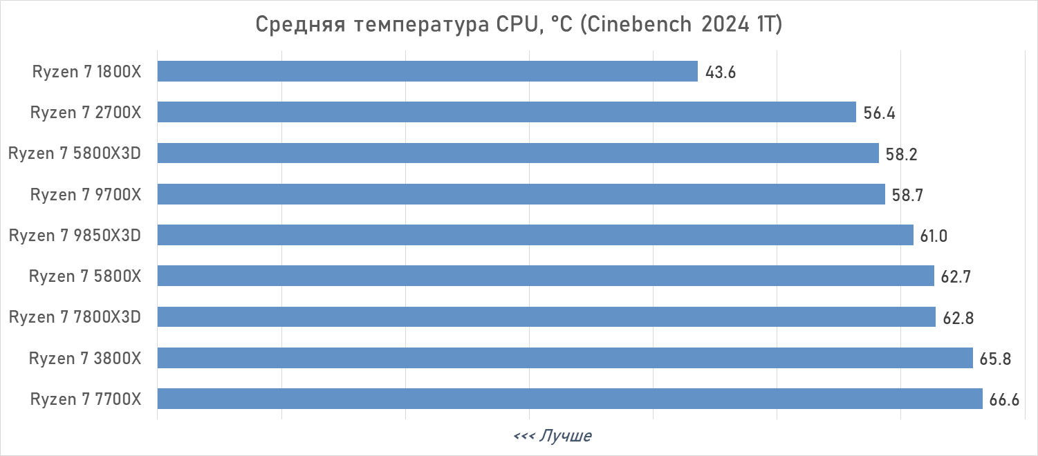 No entanto, no modo multi-thread, os resultados variam quase pela metade. Os processadores Ryzen 7 5800X3D, Ryzen 7 7800X3D e Ryzen 7 9700X estão entre os processadores de oito núcleos com baixo consumo de energia. Dois desses processadores têm frequências reduzidas devido a dificuldades na dissipação de calor do CCD, que é coberto pelo chip de cache. O terceiro pertence à classe de baixo consumo de energia, conforme determinado pela AMD. Os processadores de oito núcleos com maior consumo de energia são o Ryzen 7 2700X, o Ryzen 7 5800X e o Ryzen 7 9850X3D — modelos nos quais a AMD buscou deliberadamente frequências máximas.