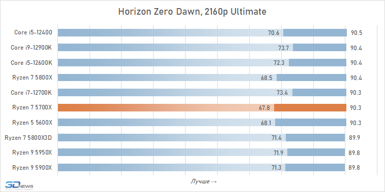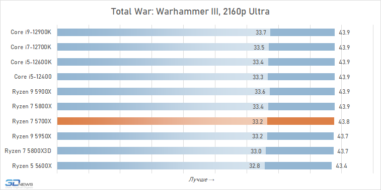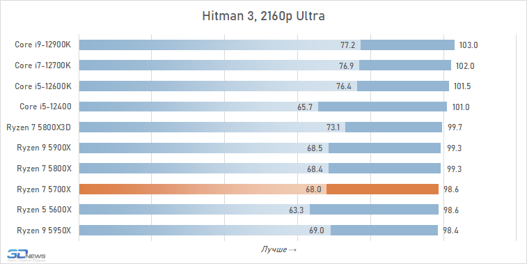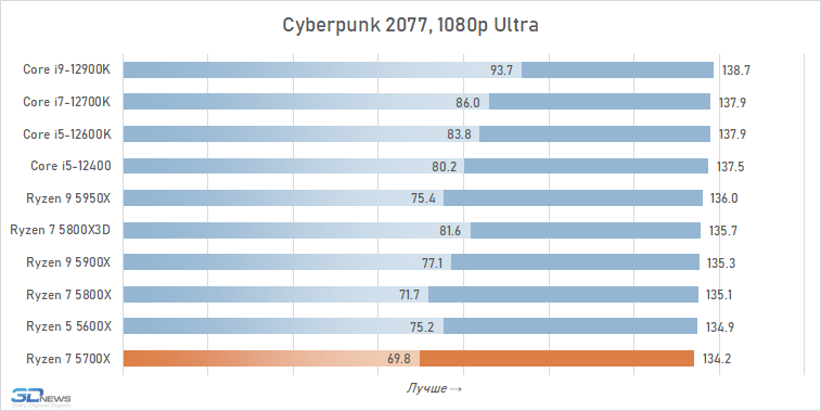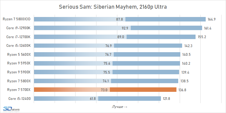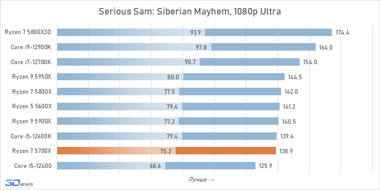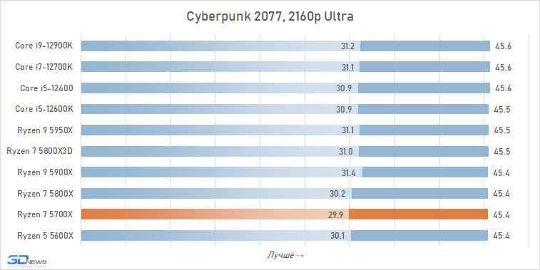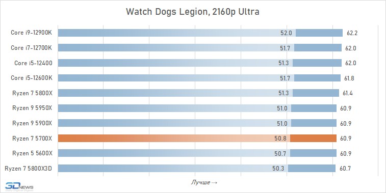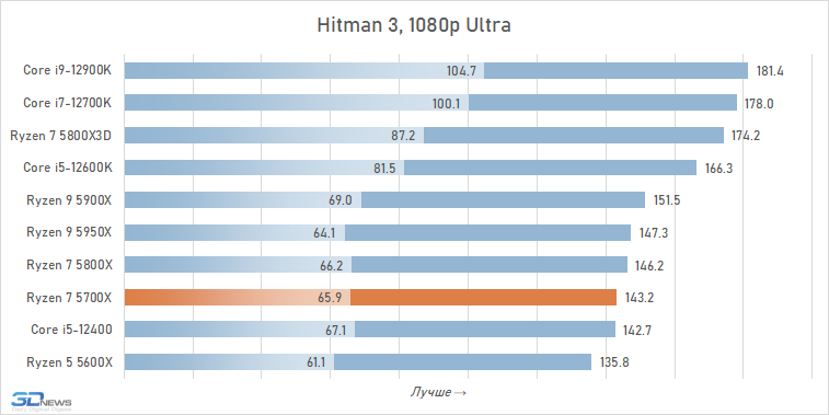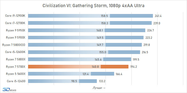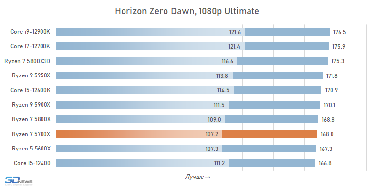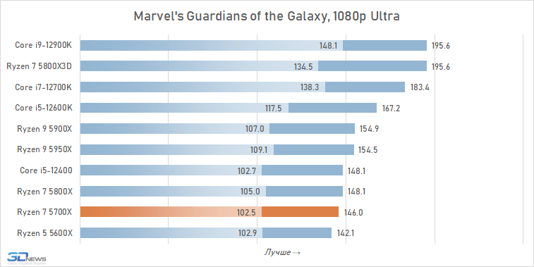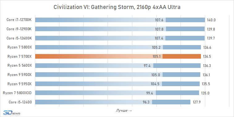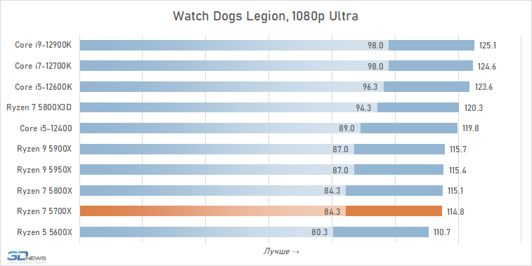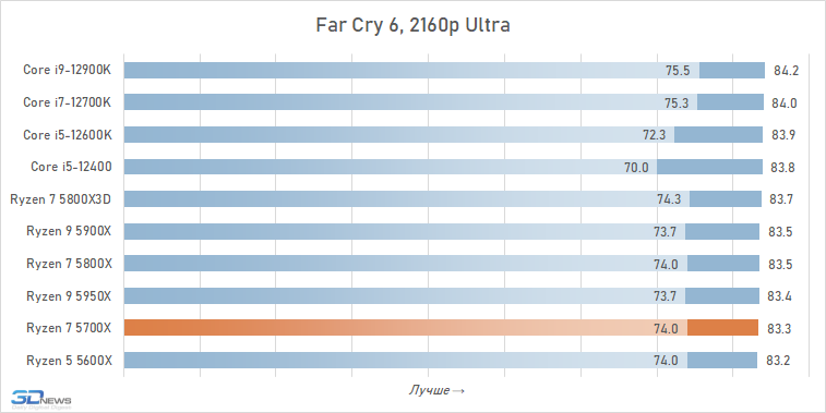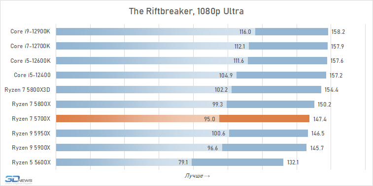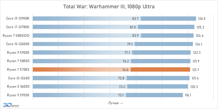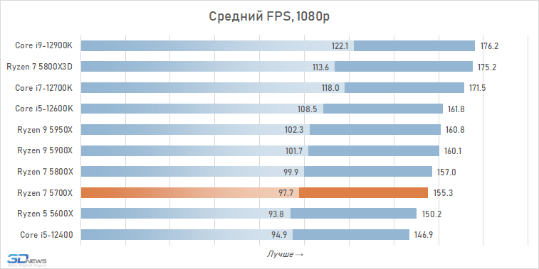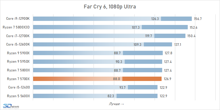 Com o advento do Intel Alder Lake, as posições dos representantes da família Ryzen 5000 nos jogos enfraqueceram visivelmente. Apenas uma CPU AMD pode competir em igualdade de condições com processadores mais poderosos que o Core i5-12600K em jogos – um Ryzen 7 5800X3D especial, equipado com um cache 3D adicional de 64 MB. Quanto ao Ryzen 7 5700X, ele, como seu irmão mais velho Ryzen 7 5800X, fica entre o Core i5-12400 e o Core i5-12600K em termos de desempenho em jogos. Ao mesmo tempo, a diferença nas taxas de quadros que o Ryzen 7 5800X de oito núcleos e o Ryzen 7 5700X podem fornecer é bastante insignificante e está dentro de um por cento. Outra coisa é o Ryzen 7 5800X3D de oito núcleos – este processador funciona em uma categoria de peso completamente diferente e se afasta do Ryzen 7 5700X em 13%.