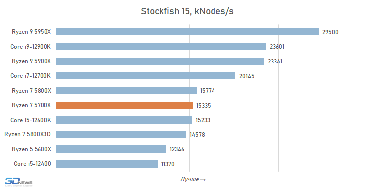 - Stockfish 15.0 – testando a velocidade do motor de xadrez popular. A velocidade de enumeração de variantes na posição “1q6/1r2k1p1/4pp1p/1P1b1P2/3Q4/7P/4B1P1/2R3K1 w” é medida.