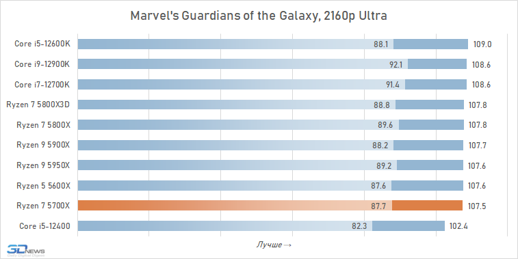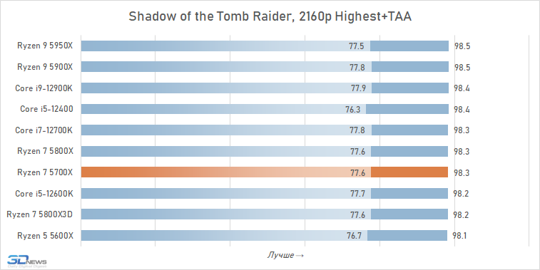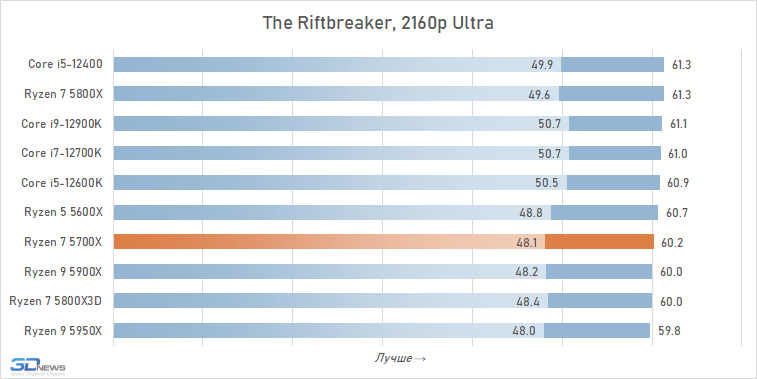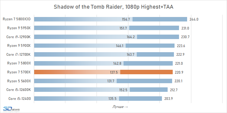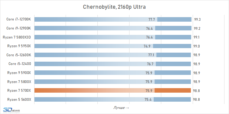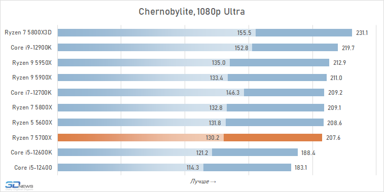 Na maioria dos casos, o Ryzen 7 5700X está à frente do Core i5-12400 e atrás do Core i5-12600K. Ao mesmo tempo, no conjunto de testes de 12 jogos há dois projetos (Chernobylite e Shadow of the Tomb Raider), em que o Ryzen 7 5700X ainda mostra FPS melhor que o Core i5-12600K. Mas, por outro lado, em quatro jogos, o Ryzen 7 5700X perde para o Core i5-12400 de seis núcleos visivelmente mais barato.