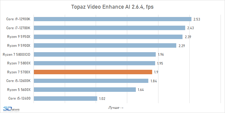 - Topaz Video Enhance AI v2.6.4 – teste de desempenho em um programa baseado em IA para melhorar os detalhes do vídeo. O teste usa o vídeo original em resolução 640×360, que é duplicada usando o modelo Artemis High Quality v12.