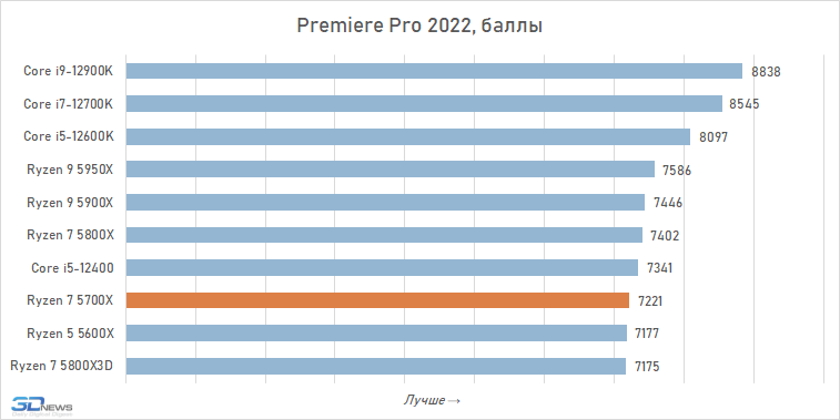 - Adobe Premiere Pro 2022 22.4.0 – Teste de desempenho de edição de vídeo. É medida a velocidade de execução do script de teste Procyon Video Editing, que simula a preparação para publicação no YouTube de um vídeo composto por fragmentos 4K filmados em uma câmera GoPro.