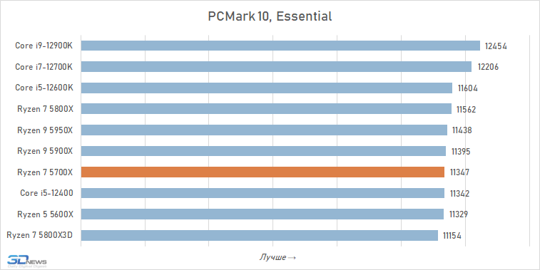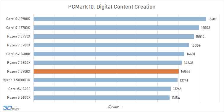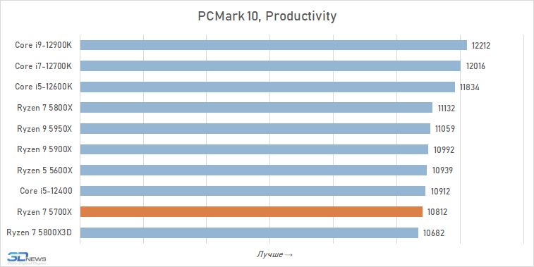 O desempenho do Ryzen 7 5700X no PCMark 10, que simula o trabalho diário em aplicativos comuns, não surpreende. Esse processador é mais lento que o modelo mais antigo, o Ryzen 7 5800X, mas mais rápido que o Ryzen 7 5800X3D, que não permite desligar os limites de consumo e, portanto, opera em velocidades de clock ainda mais baixas. Como resultado, os resultados do Ryzen 7 5700X de oito núcleos estão em algum lugar entre os do Core i5-12400 de seis núcleos e do processador Core i5-12600K com uma fórmula nuclear 6P + 4E. E parece bem fraco, pois o custo oficial do Ryzen 7 5700X é maior que o do Core i5-12600K.