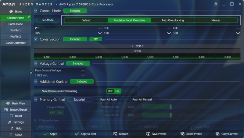 Uma configuração – Precision Boost Override – permite aumentar o desempenho do Ryzen 7 5700X em aplicativos de processamento e criação de conteúdo em uma média de 10%, mantendo todas as tecnologias usuais de economia de energia, com ajuste automático de frequência para carregar e sem comprometer estabilidade do sistema. Parece estranho sacrificar esse prêmio gratuito, especialmente porque em alguns casos você pode ganhar ainda mais – até 24% de desempenho.