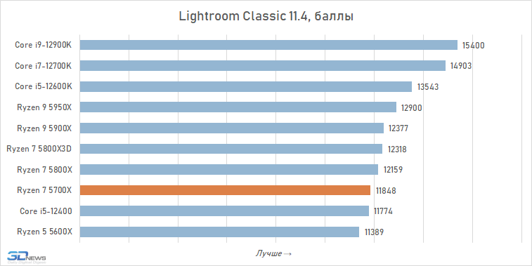 - Adobe Photoshop Lightroom Classic 11.4 – teste de desempenho para processamento em lote de uma série de imagens no formato RAW. É medida a velocidade de execução do script de teste Procyon Photo Editing, que simula a correção de cores e a edição de um conjunto de 130 fotos.