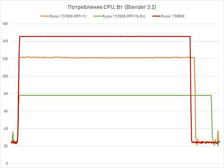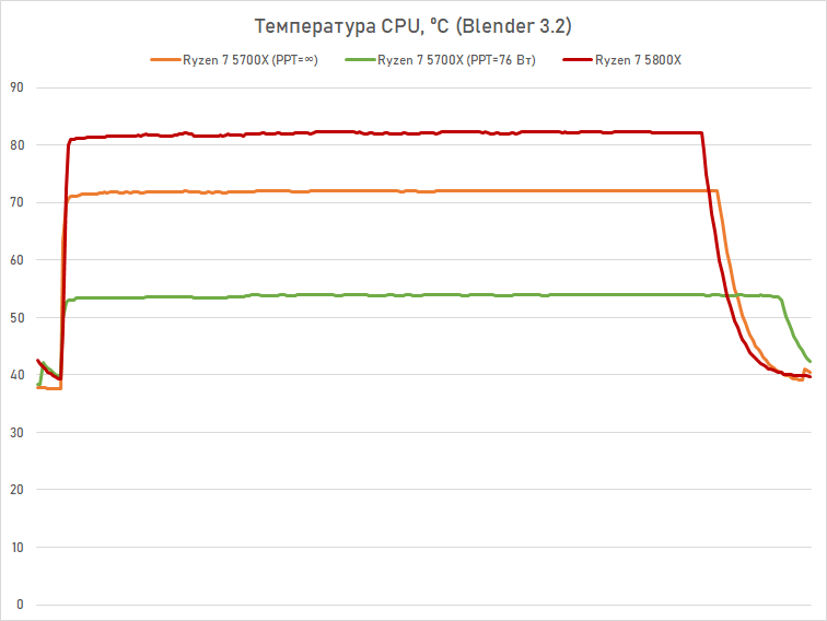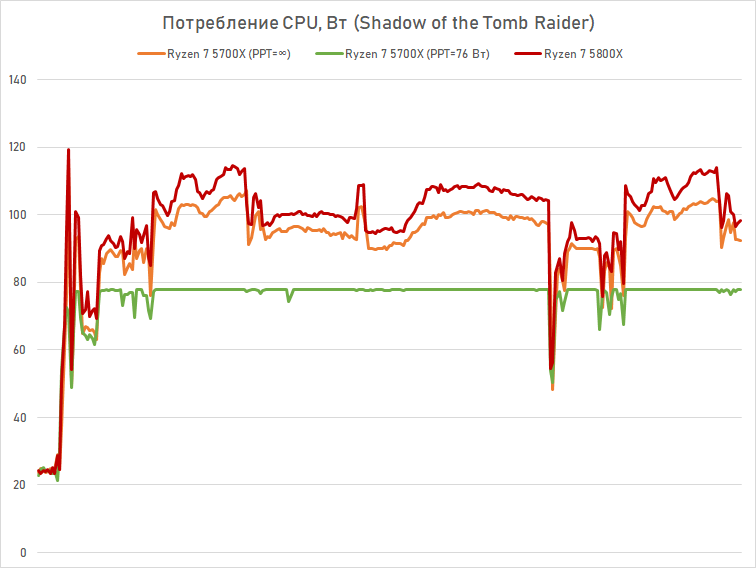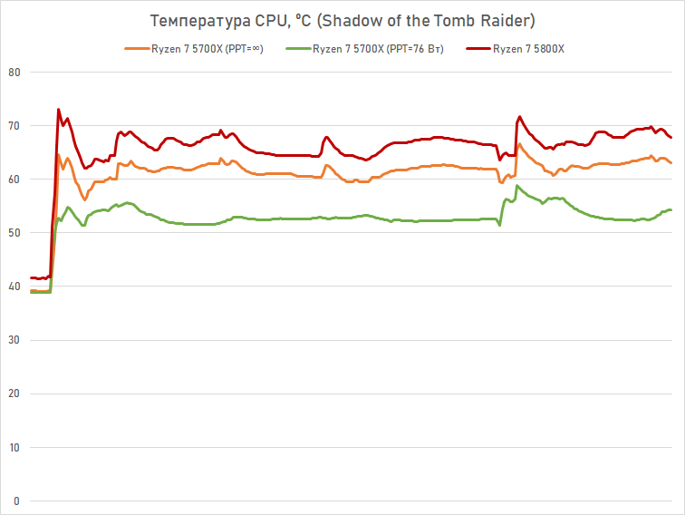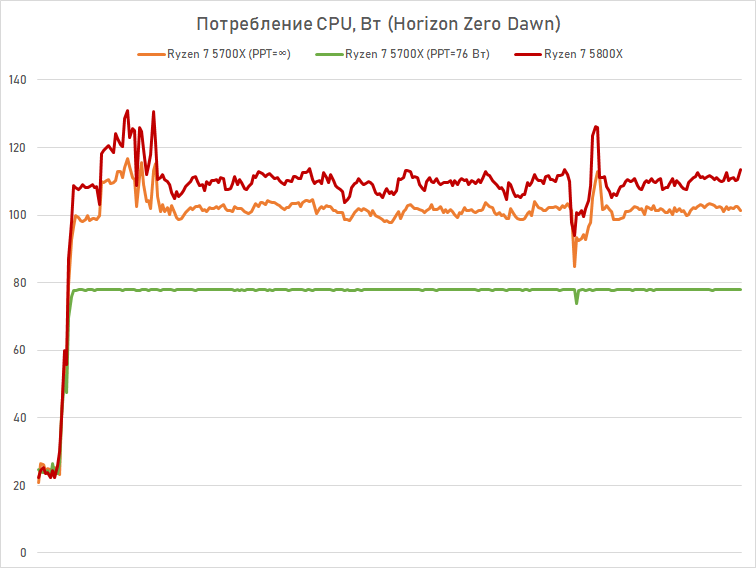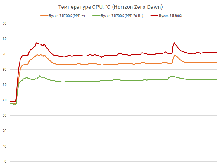 Ao mesmo tempo, os gráficos mostram claramente que, se você operar o Ryzen 7 5700X sem nenhuma configuração adicional, com o limite PPT de 76 watts ativado por padrão, seus recursos são limitados a esse limite – o consumo quase sempre fica no máximo definido , forçando o processador a redefinir a frequência tanto em tarefas que exigem muitos recursos quanto em jogos regulares. Portanto, esse modo só pode ser bom para reduzir a carga no sistema de refrigeração ou no sistema de energia: diante das restrições ativas, o Ryzen 7 5700X é surpreendentemente pouco exigente e um oito núcleos frio.