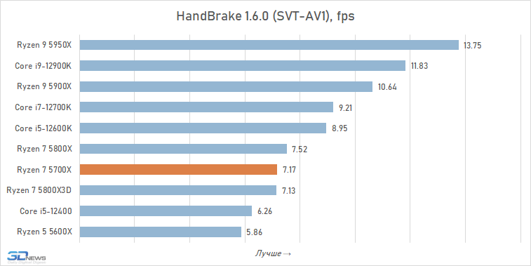 - Handbrake 1.6.0 – testando a velocidade de transcodificação de vídeo AVC 2160p@24FPS com uma taxa de bits de cerca de 42 Mbps para formatos mais avançados. Os codificadores de software x265 e AV1 (SVT) são usados.
