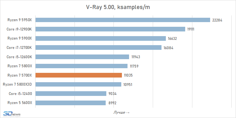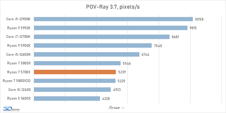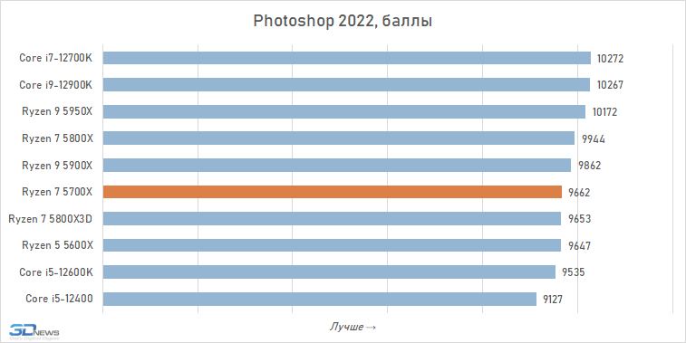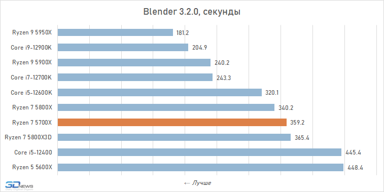 E mais um detalhe curioso: o Ryzen 7 5700X em aplicativos com uso intensivo de recursos quase não difere em desempenho do Ryzen 7 5800X3D. Ou seja, fortalecer um processador de oito núcleos com cache 3D quase não dá resultados reais naquelas tarefas que são usadas por especialistas em suas atividades profissionais.