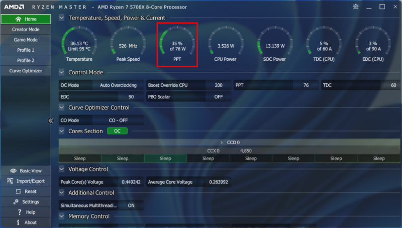 A razão para a falta de um sistema de refrigeração completo na entrega, aparentemente, é que o Ryzen 7 5700X não deve ser usado na estrutura estreita de consumo limitado e dissipação de calor. A AMD está confiante de que a maioria dos usuários optará por desempenho adicional e desligará o sufocante limite de PPT de 76 watts, pois é muito simples fazer isso – basta ativar a função Precision Boost Override no BIOS da placa-mãe (ou no utilitário Ryzen Master) .