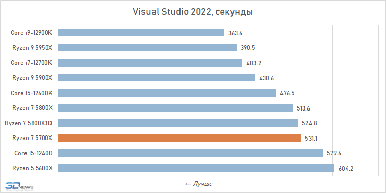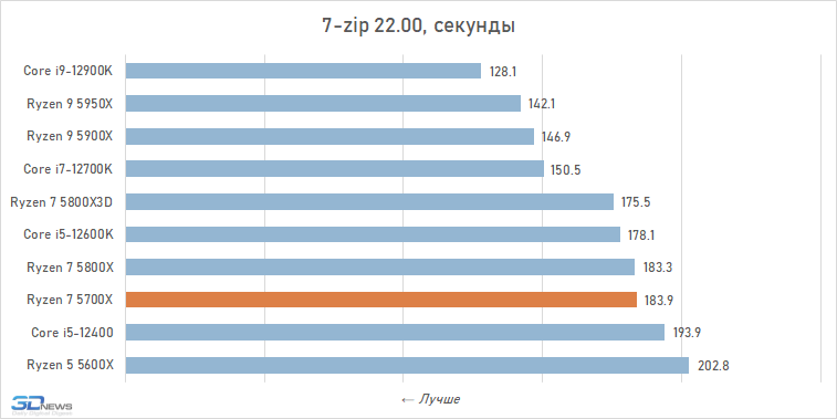 Com o papel de uma alternativa mais acessível ao Ryzen 7 5800X, o novo Ryzen 7 5700X poderia lidar com isso sem muita dificuldade. A diferença no desempenho desses processadores em aplicativos com uso intensivo de recursos não excede 6% e é em média cerca de 3,5%. Porém, na mesma categoria de preço do Ryzen 7 5700X, coexistem ofertas muito mais atrativas diante dos processadores concorrentes. O já mencionado Core i5-12600K, que pode ser comprado mais barato que o Zen 3 de oito núcleos mais jovem, é mais rápido em cenários de trabalho “pesados” em cerca de 8%. Assim, o novo processador AMD não resolve o problema de atualização da linha Ryzen 5000 tão bem quanto gostaríamos.
