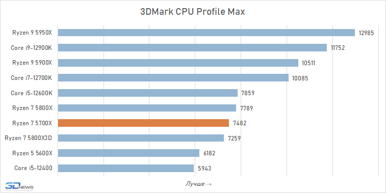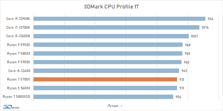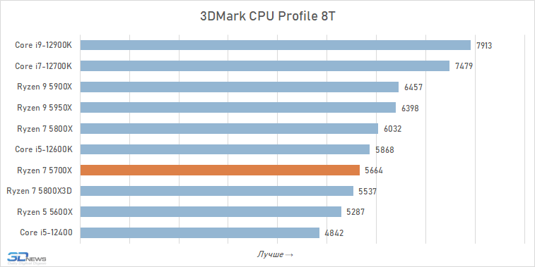 Com estimativas de desempenho de jogos feitas pelo benchmark sintético 3DMark CPU Profile, a situação é quase a mesma. Independentemente de quantos threads são testados – com um, oito ou o número máximo – o Ryzen 7 5700X é sempre mais fraco que o Core i5-12600K de dez núcleos. Além disso, em termos de desempenho single-thread, ele perde até para o Core i5-12400 de seis núcleos. No entanto, na linha Ryzen, este processador parece bastante lógico – oferece um nível intermediário de desempenho entre o Ryzen 5 5600X e o Ryzen 7 5800X, mostrando onde uma grande quantidade de memória cache não é tão importante, melhores resultados do que o Ryzen 3D aprimorado cache 7 5800X3D.