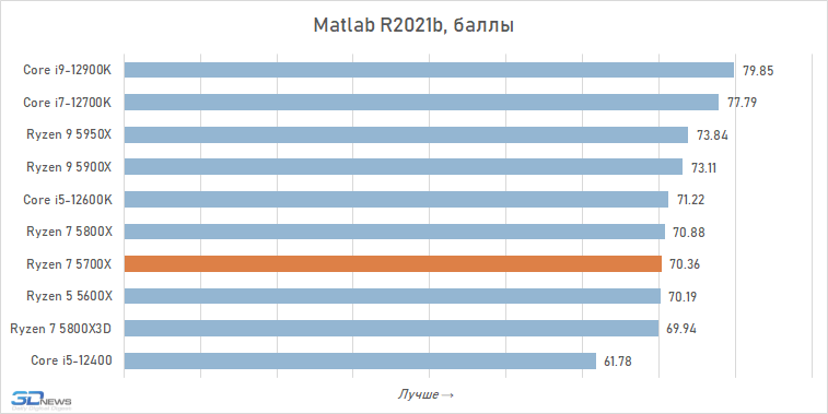 - Mathworks Matlab R2021b (9.11.0) – testando a velocidade de engenharia e cálculos matemáticos em um pacote matemático popular. Um benchmark padrão é usado, que inclui operações matriciais e vetoriais, a solução de sistemas de equações lineares esparsos diferenciais e simétricos, bem como a construção de gráficos 2D e 3D.