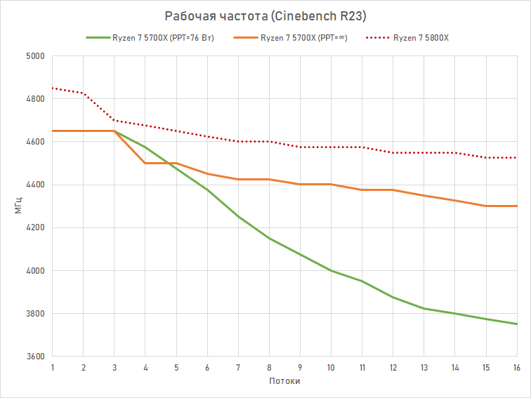 Isso leva a mudanças cardinais no comportamento do processador, por exemplo, sua frequência na carga multithread completa aumenta imediatamente em 500-600 MHz – até 4,3 GHz. Mas mesmo nesse estado, o Ryzen 7 5700X fica aquém das frequências do Ryzen 7 5800X – você pode comparar a fórmula de frequência de ambas as CPUs usando o gráfico de frequência fornecido, dependendo do número de threads executáveis. O teste de renderização Cinebench R23 foi usado como carga de referência neste gráfico.