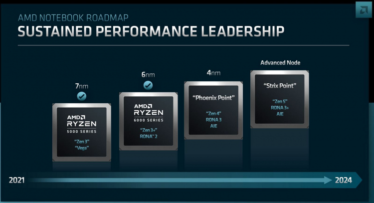 E antes do final de 2024, a AMD planeja lançar os processadores móveis Strix Point que combinarão a arquitetura Zen 5 e gráficos integrados RDNA 3+. O último não parece ser muito diferente do RDNA 3, provavelmente oferecendo melhor desempenho por watt. Esses processadores também receberão um mecanismo de IA dedicado da Xilinx. O processo de fabricação do Strix Point não está especificado, mas nota-se que será mais avançado em relação ao 4nm.