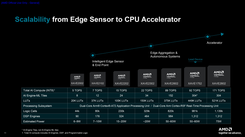 Uma das vantagens da plataforma XA Versal AI Edge é a sua escalabilidade. Por exemplo, o carro-chefe SoC XAVE2602 usa 152 motores AI com 820 mil células lógicas, bem como 984 processadores de sinal digital (DSP). A AMD afirma desempenho de até 89 TOPS (trilhões de operações por segundo) nos cálculos INT8 para este chip. A empresa também poderá oferecer plataformas XA Versal AI Edge com classificações de desempenho de 5 a 171 TOPS, projetadas para diferentes segmentos e tarefas.