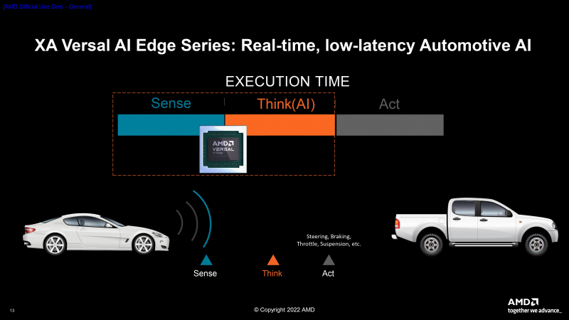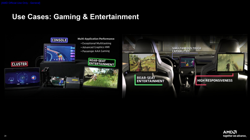 A AMD revelou produtos projetados para expandir as capacidades de IA dos carros. A primeira é a série XA Versal AI Edge de plataformas de chip único, equipadas com mecanismos de IA e uma variedade de processadores vetoriais. O seu principal objetivo é melhorar a segurança e a eficiência dos sensores LiDAR, radares, câmeras e outros sensores baseados em IA. Uma série de processadores Ryzen Embedded V2000A também foi apresentada para expandir as capacidades dos sistemas multimídia automotivos.