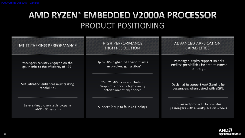 A série de processadores Ryzen Embedded V2000A foi projetada para expandir as capacidades de IA dos sistemas multimídia automotivos para o motorista e os passageiros. Esses processadores podem ser usados para controlar interiores digitais de veículos, desde o console de infoentretenimento até os displays dos passageiros.