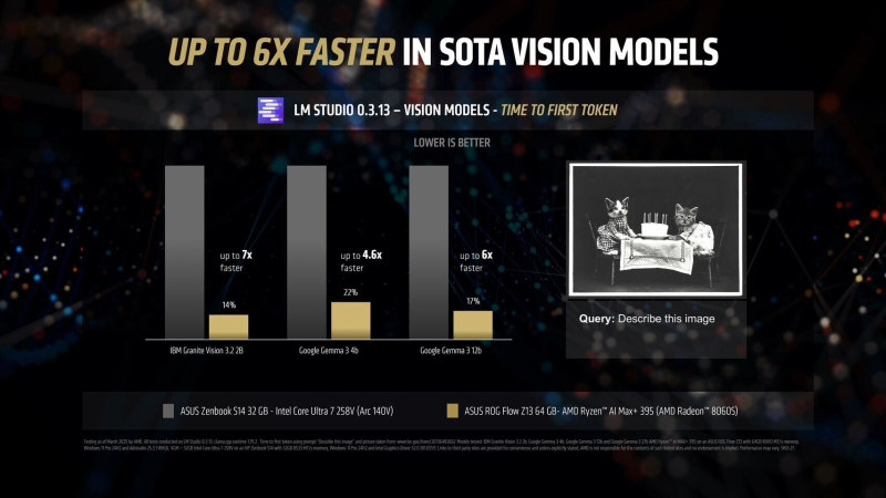 O processador AMD se destacou particularmente em tarefas de visão multimodal, onde processou entradas visuais complexas até 7x mais rápido no IBM Granite Vision 3.2 3B e 6x mais rápido no Google Gemma 3 12B em comparação ao chip Intel. O suporte de plataforma da AMD para a tecnologia Variable Graphics Memory permite que até 96 GB de memória sejam alocados como VRAM de sistemas com até 128 GB de memória unificada, permitindo a implantação de modelos de linguagem modernos, como o Gemma 3 27B Vision do Google.