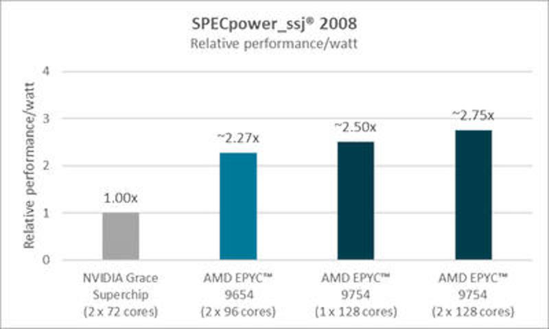 De acordo com os testes da AMD, seus processadores EPYC 9754 (128 núcleos) e 9654 (96 núcleos) mais que dobram o desempenho do Nvidia Grace Superchip de 72 núcleos em uma variedade de cargas de trabalho, incluindo computação de uso geral, Java, bancos de dados transacionais e adoção soluções de suporte, servidores web, análises, codificação de vídeo e computação de alto desempenho (HPC). Assim, no teste SPECpower_ssj2008, os sistemas de um e dois soquetes baseados no AMD EPYC 9754 superaram o Nvidia Grace em cerca de 2,50 e 2,75 vezes, respectivamente, e um servidor de dois soquetes no AMD EPYC 9654 acabou sendo mais rápido que seu equivalente da Nvidia em cerca de 2,27 vezes.