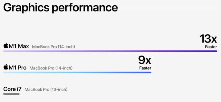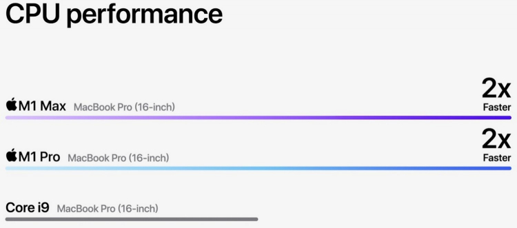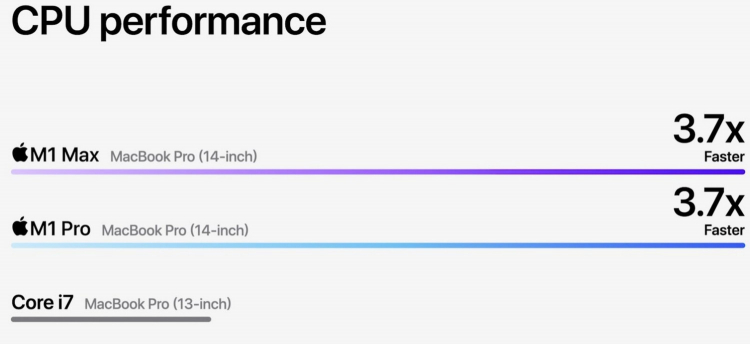 Se compararmos os novos chips da Apple com as soluções Intel no MacBook Pro das gerações anteriores, então a diferença é múltipla. Portanto, a CPU dos novos produtos é 2 vezes mais produtiva do que o Core i9 nos antigos MacBook Pros de 16 polegadas e também 3,7 vezes mais produtiva do que o Core i7 dos antigos MacBook Pros de 13 polegadas.