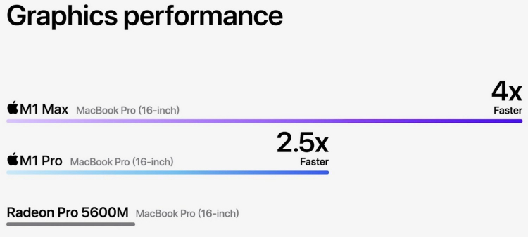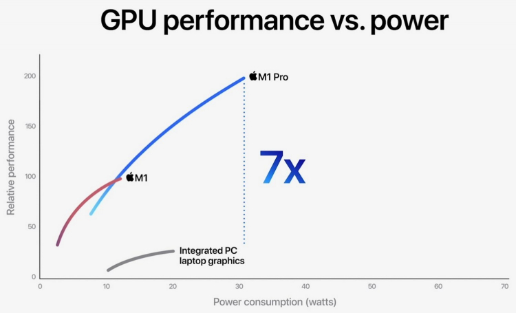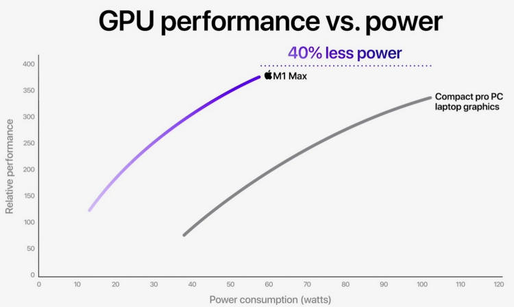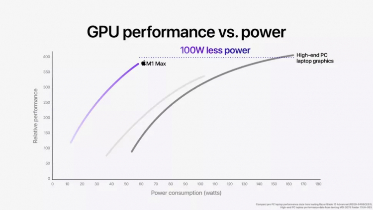 A eficiência aprimorada dos novos chips também é observada. Por exemplo, o Apple M1 Max consome 100 watts a menos do que uma placa de vídeo discreta de alto desempenho sem nome. Mas esses gráficos são encontrados principalmente em sistemas de jogos massivos. Comparado com notebooks profissionais compactos, a diferença no consumo de energia com desempenho comparável é de 40%.