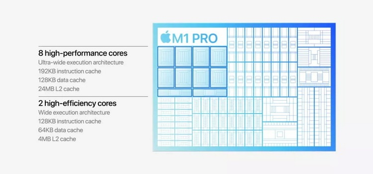 O Apple M1 Pro usa 10 núcleos de computação (8 eficientes e 2 eficientes em termos de energia), bem como 16 núcleos gráficos com 2.048 unidades de execução. A empresa afirma um aumento de 70% em computação e 2x o desempenho gráfico em relação ao processador M1. Os laptops MacBook Pro baseados no chip M1 Pro oferecem até 32 GB de RAM.