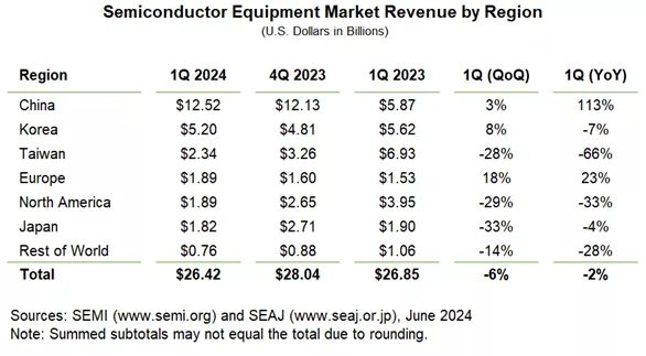 De acordo com as últimas estatísticas SEMI, a receita geral de equipamentos de chips no primeiro trimestre não foi tão favorável como nos períodos anteriores, pois caiu 2% ano a ano para US$ 26,4 bilhões e 6% sequencialmente. Ao mesmo tempo, os fabricantes de chips chineses mais do que duplicaram as suas compras de equipamento e representam agora 47% dos gastos globais.